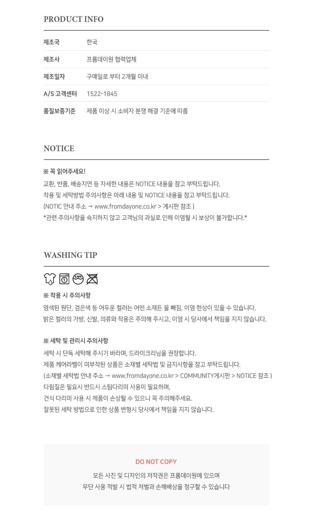 · 衣物第一次清洗建議乾洗,若無洗標之商品請詢問專業洗衣店,並建議清洗後再穿著。