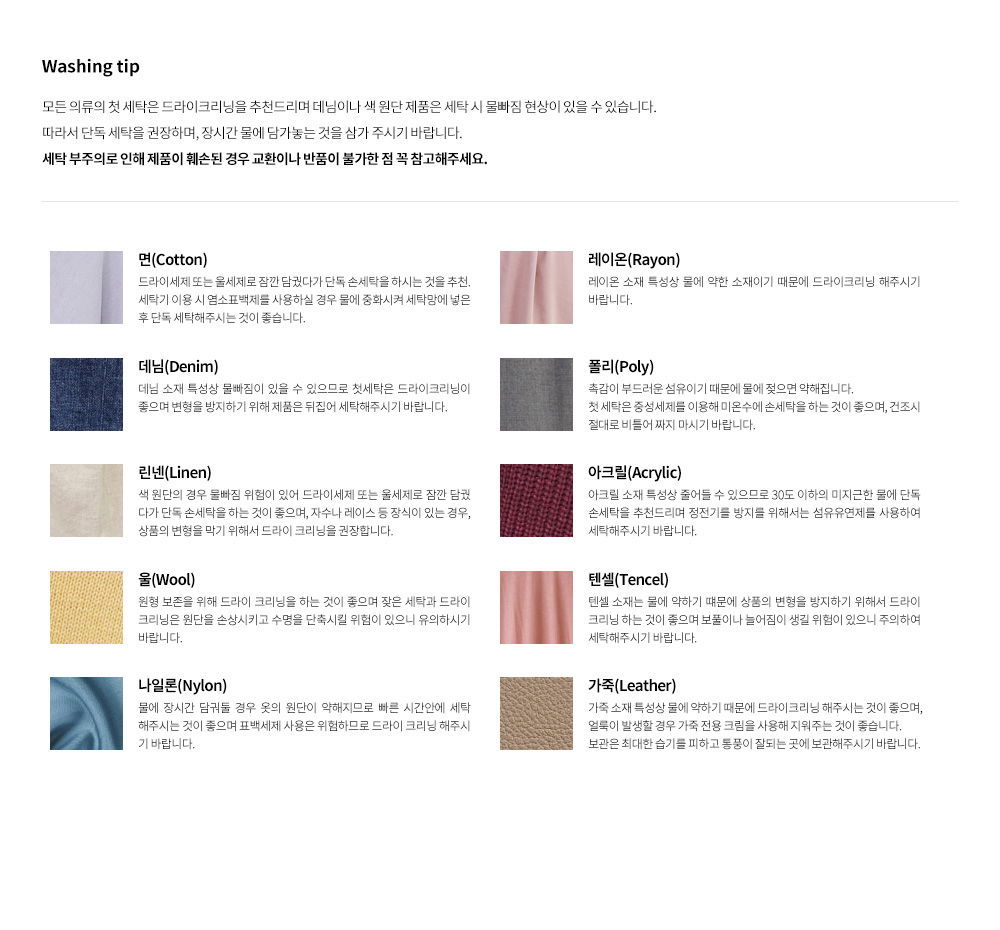 · 衣物第一次清洗建議乾洗,若無洗標之商品請詢問專業洗衣店,並建議清洗後再穿著。