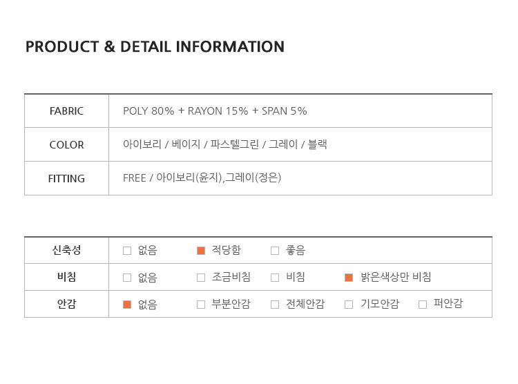 商品材質 : 聚酯纖維 80%,人造絲 15%,氨綸 5%